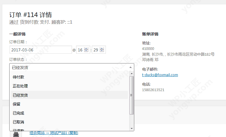 在你的主题function.php中增加这两段代码之后保存,进入woocommerce的后台–订单–编辑订单,在订单状态处即可看到我们所增加的状态: